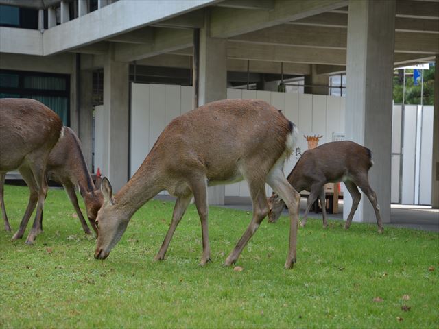まずは県庁に向かいます。そこで見たのは県庁の中庭に鹿がいるではないですか。今回の奈良観光の目玉の一つが鹿と戯れることなので、いきなりテンションが上がってきました。