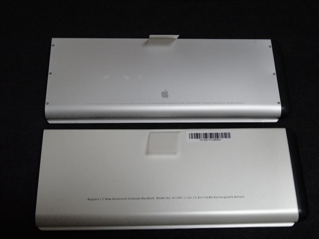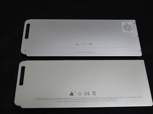 裏側です。上が膨らんだ純正バッテリー。下が互換バッテリー。