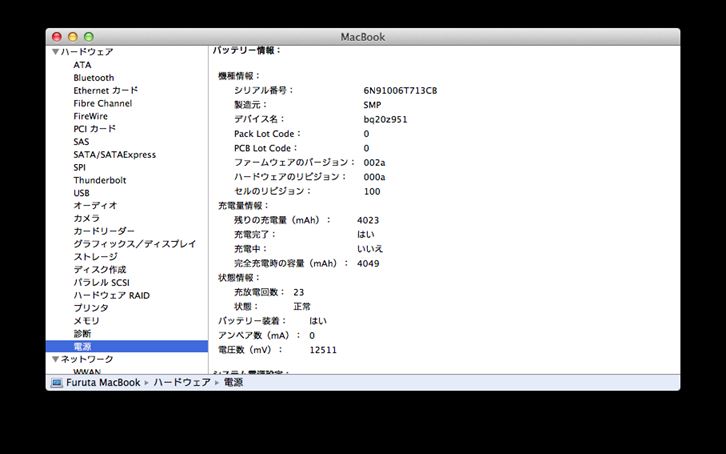 バッテリーの容量は4049(mAh) 充電回数:23回 状態:正常