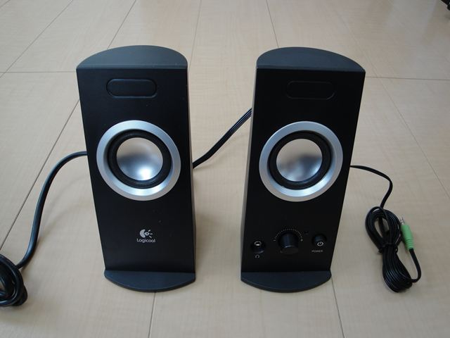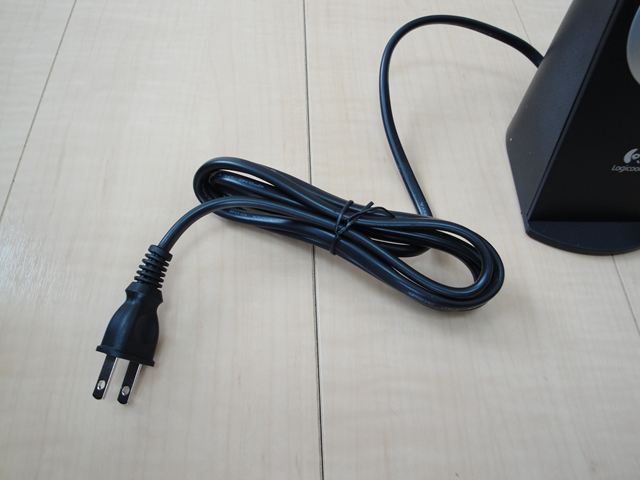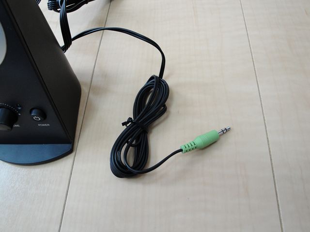 反対側のスピーカーにはPOWERスイッチ、VOLUMEツマミ、ヘッドフォンジャックがあり、背面から入力用のケーブルがでています。USB接続ではなくPCのヘッドフォン出力端子に接続します。