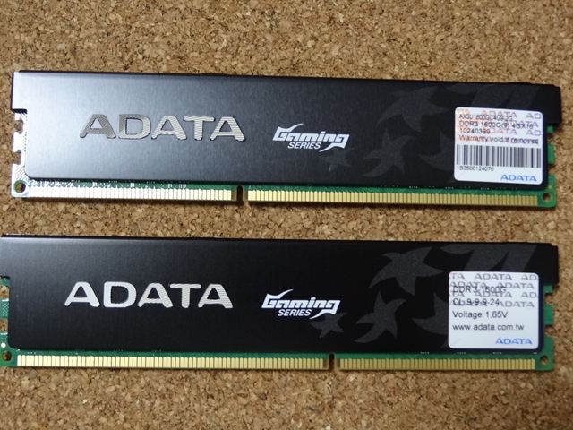 これがメモリです。普通はプリント基板にメモリのチップが半田付けされている様子が見えるのですが、今回購入したメモリはヒートスプレッダかヒートシンクのようなものが取り付けられておりチップは見ることが出来ません。