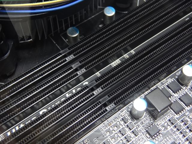 メモリの取り付けはメモリの切り欠きとソケットのボッチを合わせて上からガツンと押し込めばOKです。その時ソケット両端のレバーが元の位置に戻っていることを確認します。