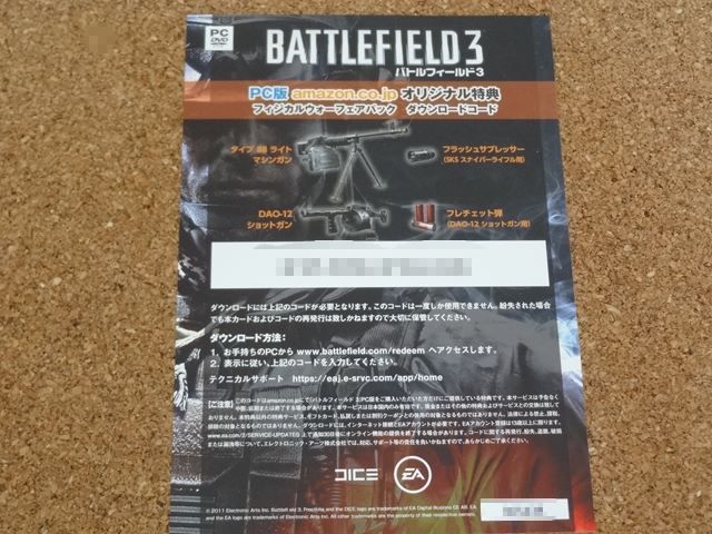 『Battlefield 3』を予約注文すると「Back to Karkand」拡張パックが無料で入手出来ます。その為のキーが書かれたカードが同梱されていました。