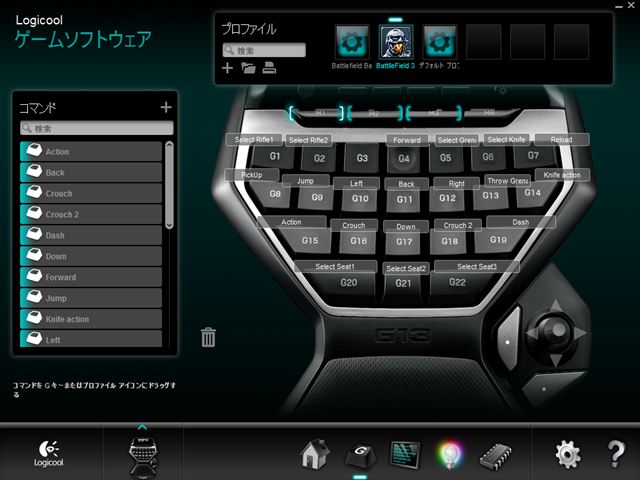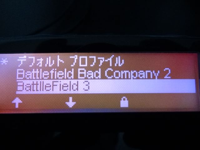そうすると液晶表示部にと保存したゲームプロファイルが表示されるようになります。BattleField3で登録しましたので、それが表示されています。”Battlefield Bad Company 2”が表示されていますが、これはPC上にあるゲームを探して勝手に表示している物です。残念ながらこのプロファイルではキーアサインは使えませんでした。