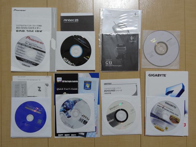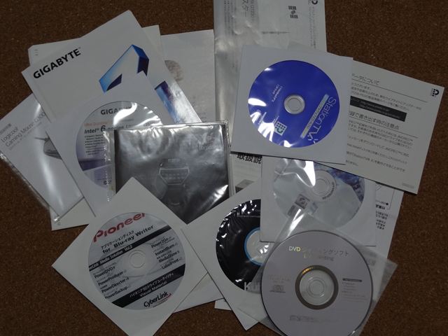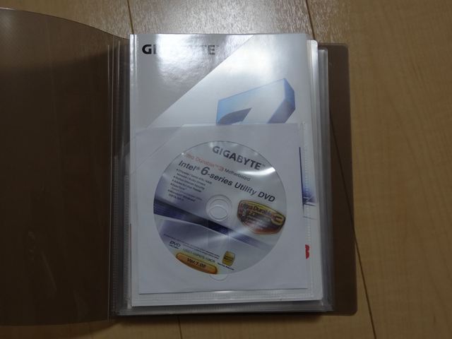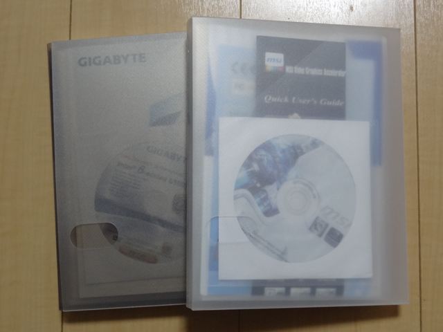 マザーボードやドライブには説明書と共にアプリのインストールディスクがついてきます。これらをそれぞれの箱に戻してしまうと、再インストールする時などひっぱり出すのが面倒なので、市販品の取扱説明書を保存するファイルを使って整理しようと考えました。