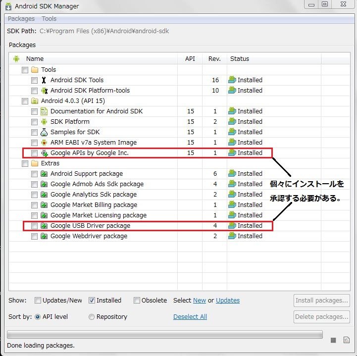 私がちょっとつまずいたのが⑧SDK Managerを起動。(右クリック→管理者として実行)、上の画像で「Installed」になっているファイルをすべて選択し、赤枠のボタンをクリックしてダウンロード。というところで項目にレ点入れてinstallボタンを押しましたが2つだけinstallされませんでした。よく画面をみるとこれらはacceptにチェックをいれてinstallしなければなりません。