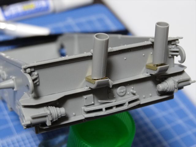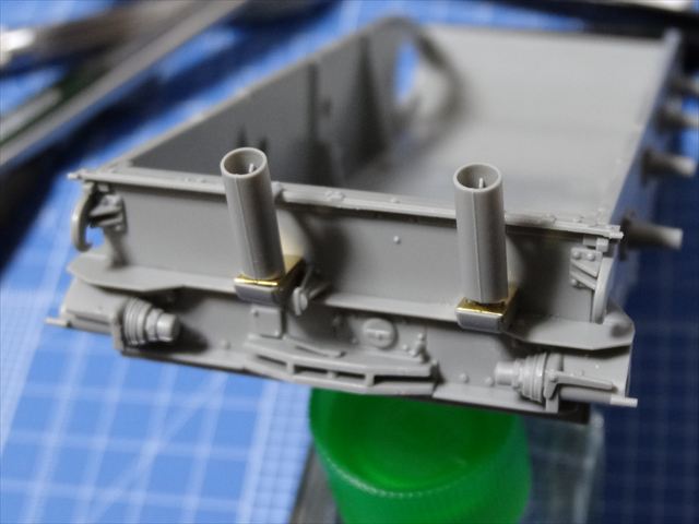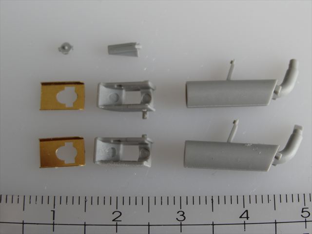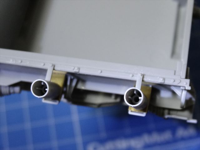 後部パネルに取り付く排気マフラーを組み立てます。