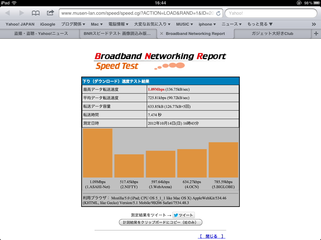 下り 1.09Mbps Webサイトの閲覧には問題ない速度です。しかし「Xi」の速度では無いですね。