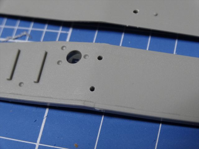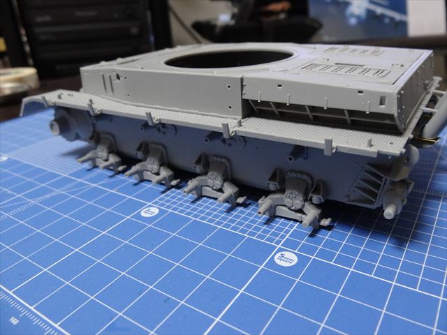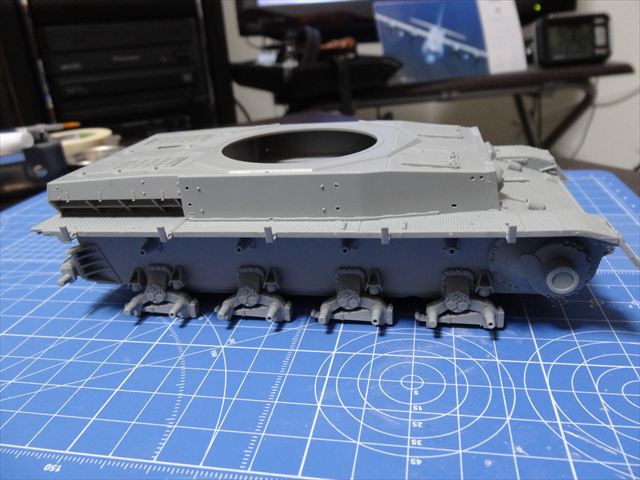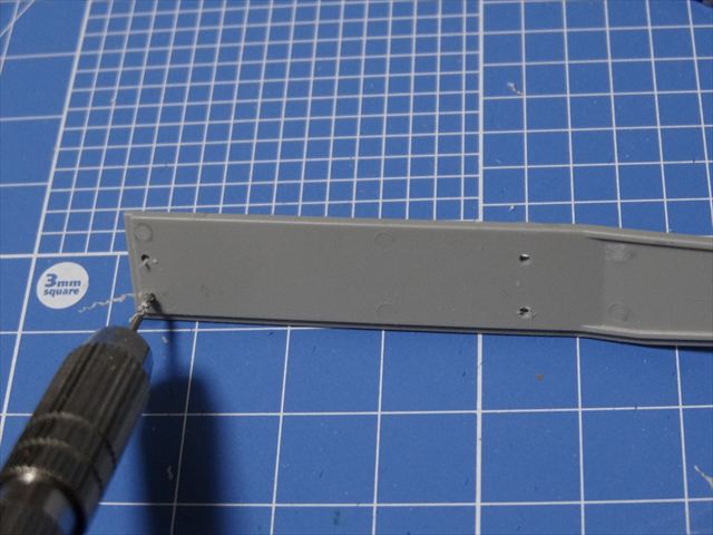 左右側面装甲板にドリルで穴をあけます。ここはシュルツェン取付架の取付穴になります。