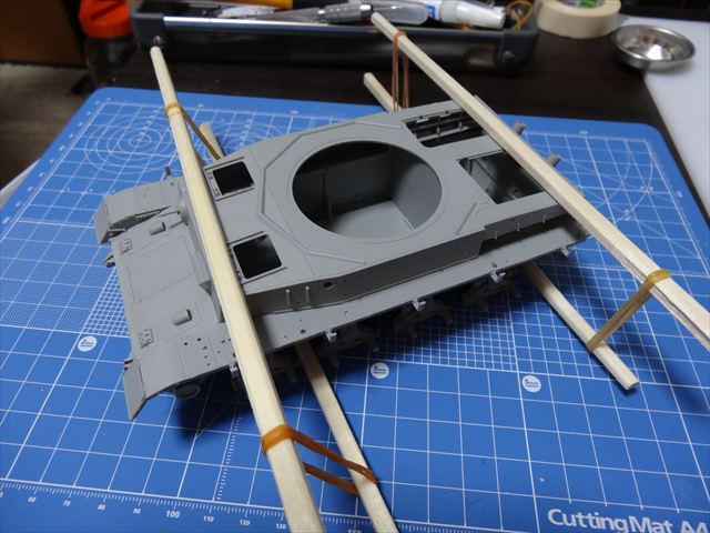 シャーシーと上部構造物を接着します。一部に隙間が出来るのでこのようにしてガッチリ接着しました。