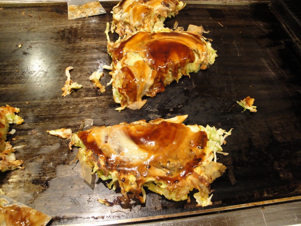 上にマヨネーズ、次にソースをかけます。普通は逆じゃない。
