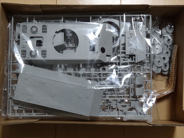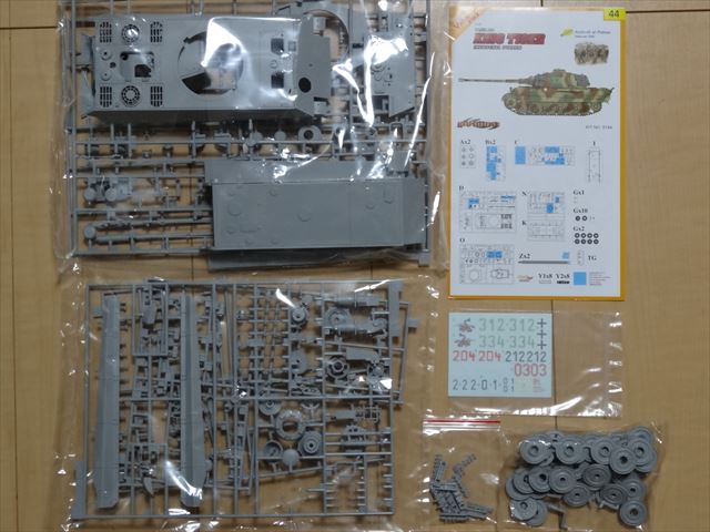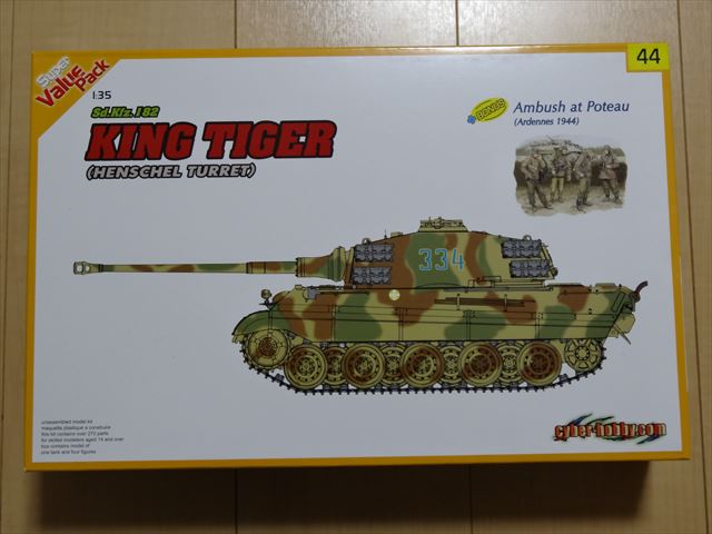 サイバーホビーの1/35 キングタイガー(ヘンシェル砲塔)+ポト-迎撃戦アルデンヌ1944 を買いました。スーパーバリューパックです。スーパーバリューパックは過去に販売されていたキットからエッチングパーツや金属砲身等のパーツをプラ製に置き換え価格を抑えたものらしいです。