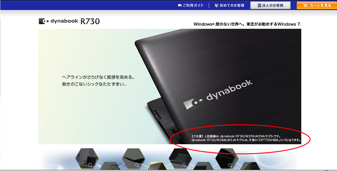 それは天板のロゴです。店頭モデルは”Dynabook”と書かれていますがWeb直販モデルは”TOSHIBA”となっています。何故このような違いがあるのかは不明です。