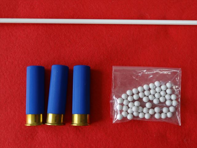 付属品は取扱説明書、ショットシェル 3個、サンプルのBB弾。ショットシェルが3個では足りませんね。