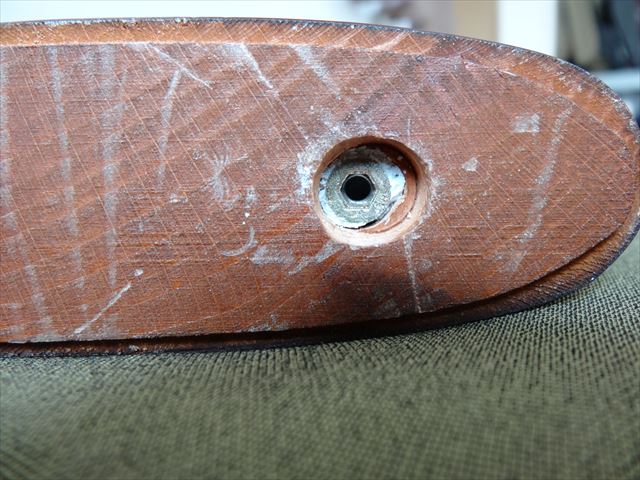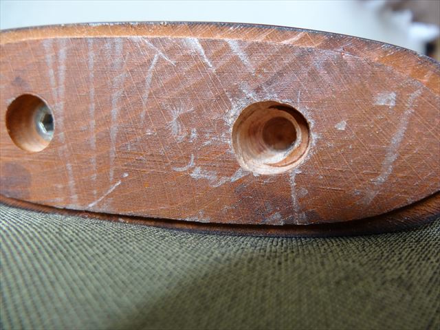 ストックの交換前にバットプレートをプラのストックから外し、木製ストックに移植するのですが、ここで困った問題が。バットプレートの取付け穴は2つあるのですが、その間隔が3mm位違っているのです。このままではネジ止め出来ません。そこで木製ストックの穴に埋めてあるナットを取り、穴を長穴に加工します。