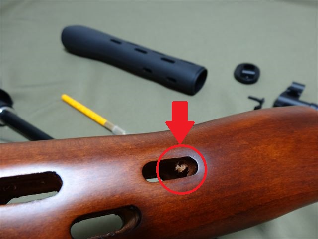 木製のハンドガードを取り付ける前に、木製ハンドガードの削りかすが残っているので、ナイフ等できれいにしておきます。