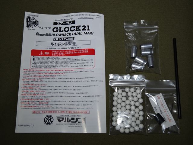 取扱説明書、サンプルBB弾(8mm)、カートリッジ(6発)、クリーニングロッド等が入っています。