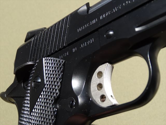 ビーバーテイルのグリップセーフティ。動きは軽いですね。もう少し重々しい動きが欲しいところ。