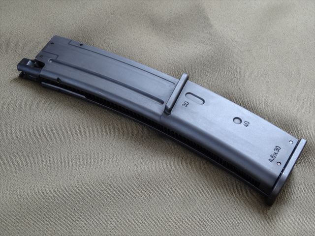 VFCのMP7A1が発売になり東京マルイとKSCのモデルが実銃よりも小さいと言われています。真意の程は分かりませんが4.6mm×30弾の全長が38mm位とすると東京マルイのマガジンの幅は36mm位しかありませんのでカートリッジが入りません。ちょっとがっかりですが、その分作動ががよいのでOKとしましょう。