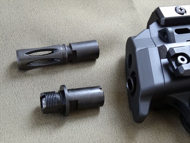 フラッシュハイダーを外して、同梱のマズルアダプタを取り付けます。