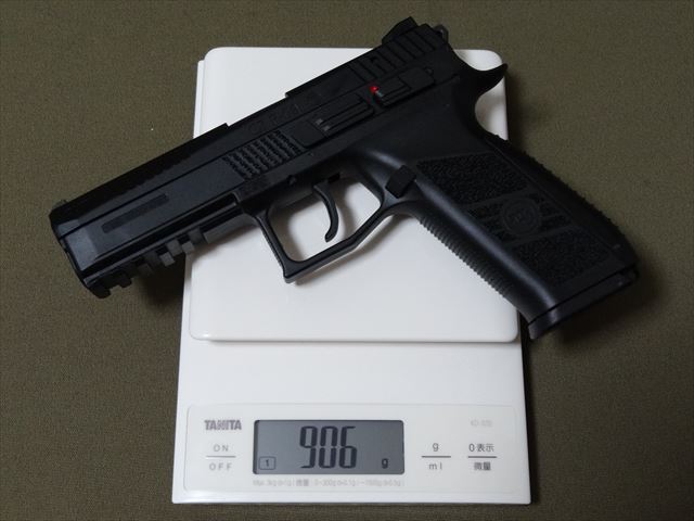 KJWのCZ P-09 DUTYはマガジン込みで906g。結構ずっしりとくる重さです。