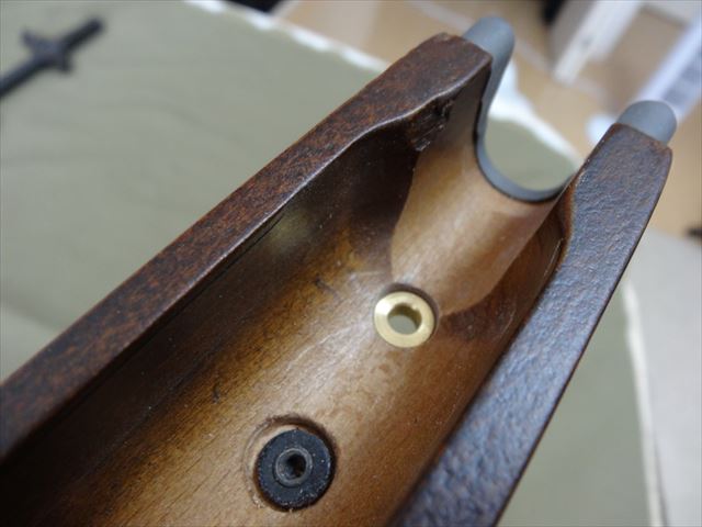 そのまま取り付けるとストックの内側にスクリューの頭が飛び出てしまい、バレルにあたってしまいます。