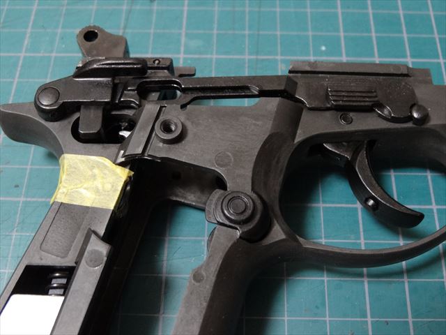 グリップのあたりに見えているテープはシアーピンの抜け防止です。このピンはシアーピンガイドにゆるく入っているだけなのですぐに抜けてしまいます。組立中にどこかへ行ってしまわないようにテープで留めています。グリップがつけば抜けることはありません。