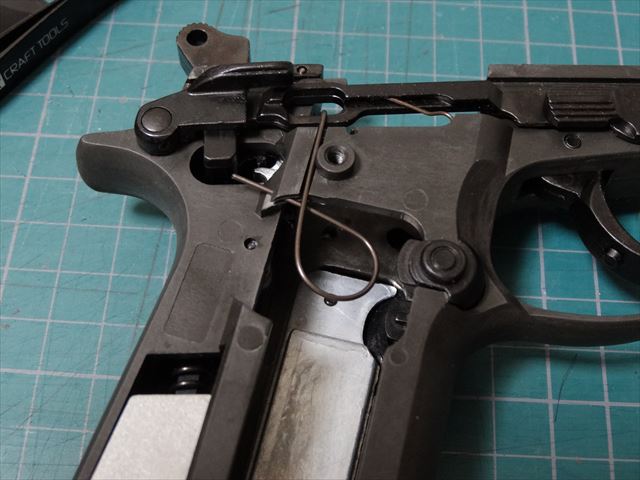 マガジンセフティスプリングを取り付けます。このスプリングはマガジンが入っていない時にトリガーバーを下方に引っ張り、トリガーを引いてもハンマーが落ちないようにするためのものです。マガジンを入れるとマガジンがこのスプリングを押し上げ、トリガーバースプリングの力でバーを上方に持ち上げハンマーが作動するようになります。