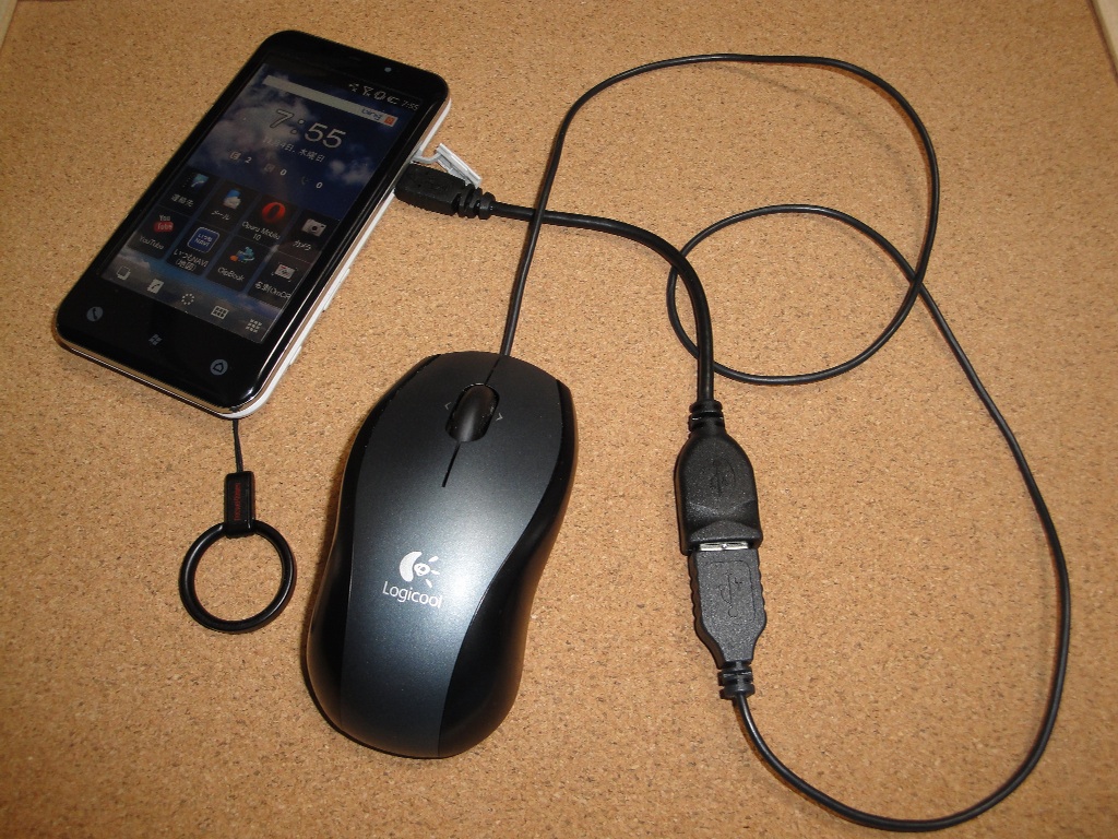 IS02のMicro USB端子はUSBホスト機能を持っています。そこで親機のPCに繋ぐだけでなくマウスやUSBメモリも接続可能なんです。