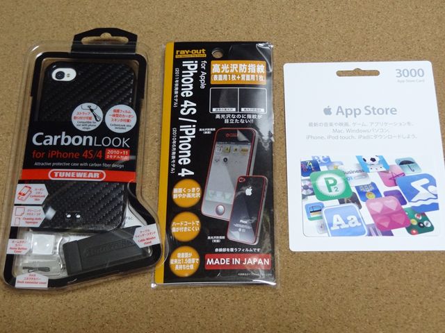 それから本日、本体の他に購入してきたモノです。IS03は裸で使っていましたがiPhoneは裸ではキズが心配です。そこでケースと保護フィルムを購入。またキャンペーンでiTunesカードが20%オフということだったので3000円のカードを購入しました。