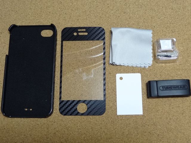 左からケース本体、カーボンスキン(カーボン地の保護フィルム)、クリーニングクロス/コテ、DOCKコネクタカバー/ホームボタンカバーと下の黒いのがケーブルワインダースタンドです。