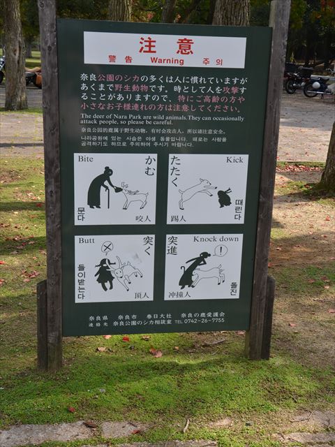 これは鹿に襲われないように注意してねという看板ですが、この他に鹿せんべいの他にお菓子なんかをあげないようにしなければなりません。