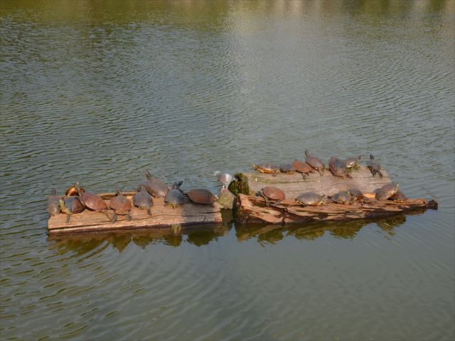 猿沢池の亀たち。亀に紛れて鳩が一羽います。