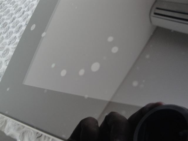 ⑥それでも残る気泡は単なる気泡ではなく、ホコリ等が挟まっています。これは保護シートを少しずつ剥がして