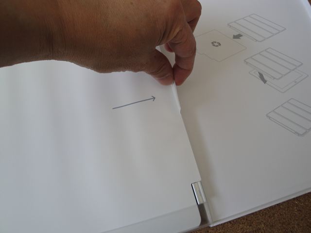 ②保護シートの位置決めをするためホームボタン側の裏紙を3cmほどめくって切り取ります。