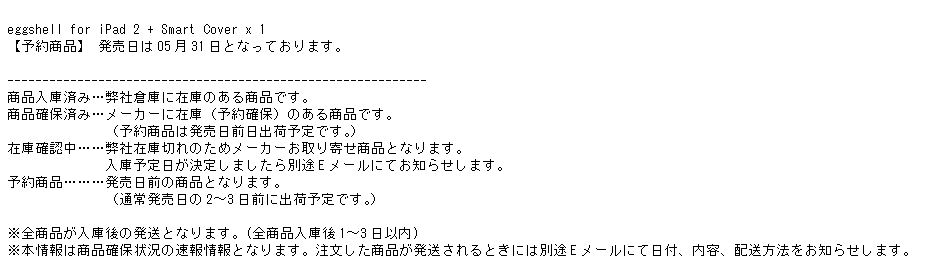 それによると「eggshell for iPad 2 + Smart Cover」の発売は5/31となっており、発売日の2~3日前に発送の予定とのことです。iPad2の入手時には間に合いませんね。