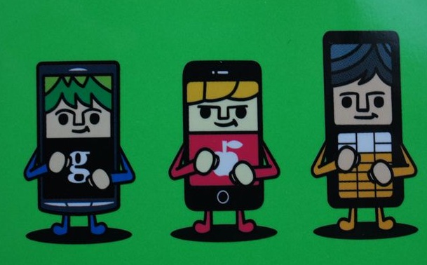 こんなキャラクターが左上に描かれていますが左側からAndroid、iPhone、ケータイのキャラです。
