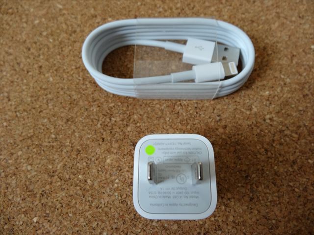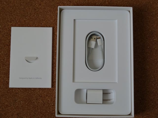 Lightning Cableと充電器です。充電器はiPhoneと同じものです。ストアスタッフに聞いたところiPad2の充電器でも問題なく使えるそうです。