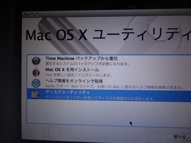 そこで一度MacBookの電源をオフにして再度電源をオンにし直後に「option」+「R」を押してMac OS X ユーティリティを立ち上げます。
