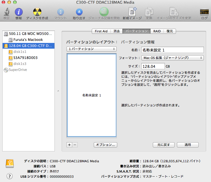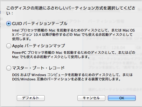 ディスクユーティリティを立ち上げ、HDDにパーティションの作成を行います。パーティション作成時にはオプションを確認して、GUID形式になっているかチェックしておきます。起動ディスクとするにはGUID形式でパーティションが作成されている必要があります。