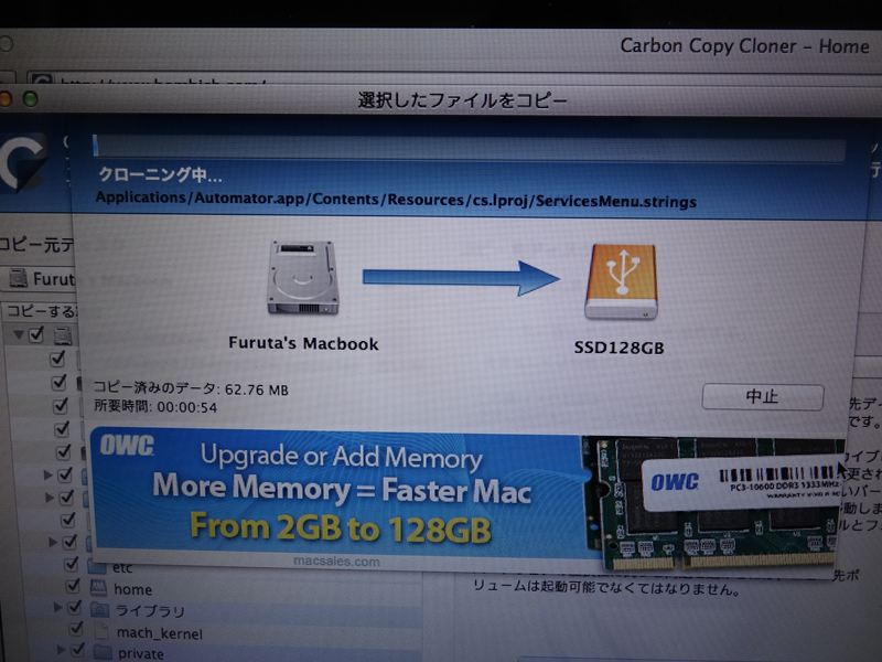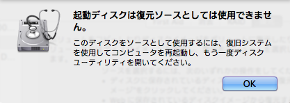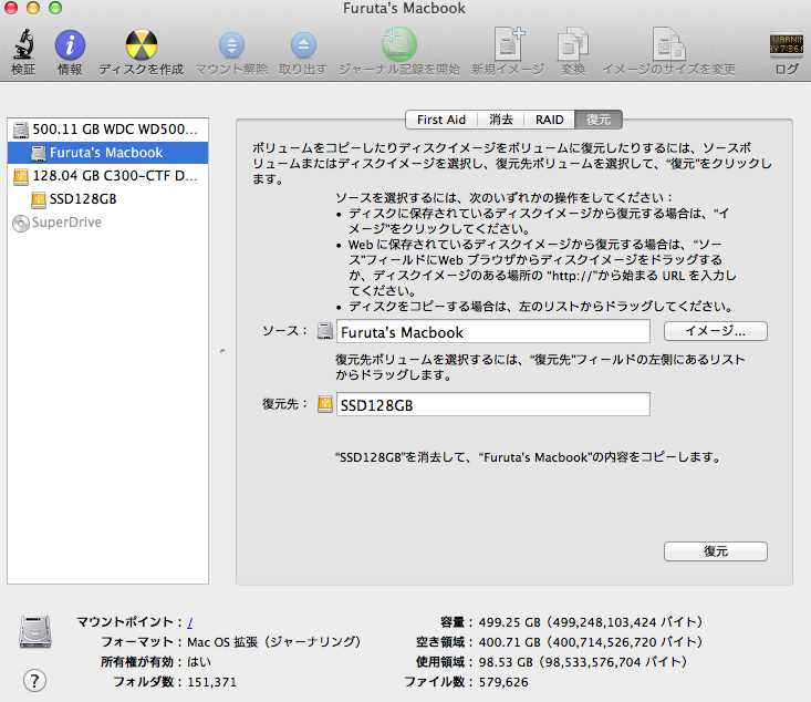 次に同じくディスクユーティリティの復元を選び”ソース”にHDDを”復元先”にSSDを選択し復元を実行。
