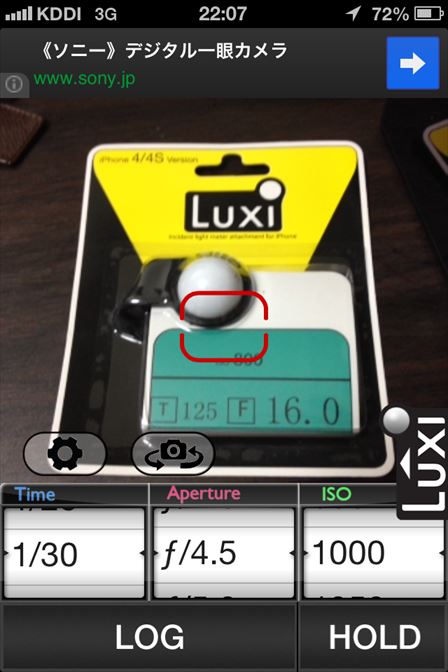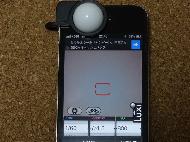 この状態で被写体の傍にiPhoneを置いて露出を計測します。ここで測定しているのは被写体にあたっている光、すなわち入射光を計測しています。
