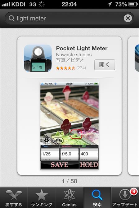 iPhoneには「Pocket Light Meter」というアプリをインストールしておきます。