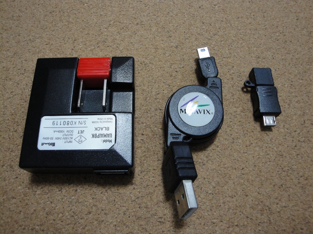 それからIS01、IS02共に充電する場合は携帯充電器のコネクタをMicro USBに変換して行いますが、アダプタをいろいろ持ち歩くのは不便なので、よくあるMiniUSBをMicroUSBに変換するアダプタが便利です。(写真の右端にあるのが、そのアダプタです)
