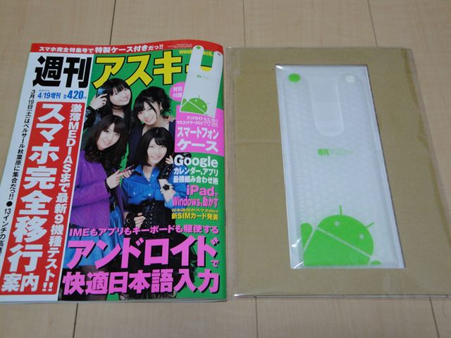 ほぼ毎週買っている週刊アスキーの4/19増刊号にアンドロイドマスコットマーク入り特製スマートフォンケースが付録でついてきました。