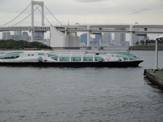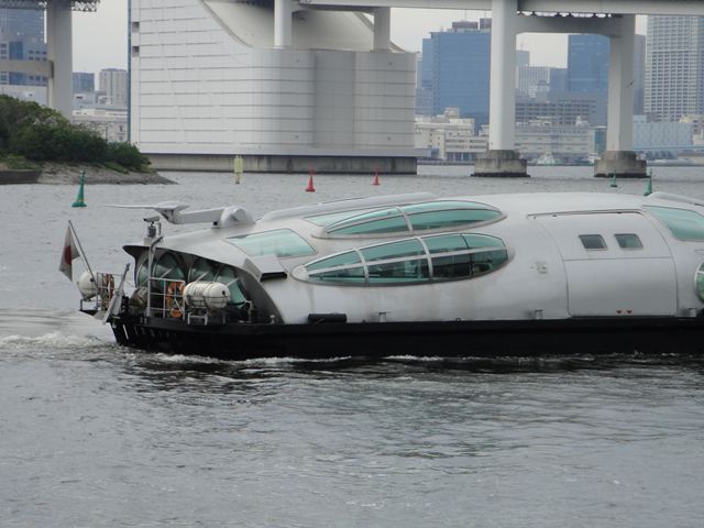 お台場から水上バスで日の出桟橋に向かいます。船着き場で乗船する船を待っていると宇宙船のような水上バスがありました。後ろからみたところなんてかっこいいですね。これは「ヒミコ」といいます。