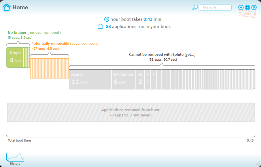 またSolutoをインストールすると起動時に画面の左下に起動中のプロセスを表示してくれて、最終的に起動に要した時間を教えてくれます。