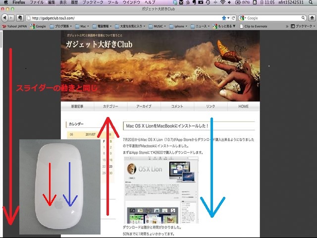 Mac OS X Lionの新機能にマルチタッチジェスチャー機能の拡充がありますが、これでちょっと戸惑いました。Liionをインストールしてあれこれ試している時にブラウザを操作しているとマウスの操作と画面のスクロールの動きに何か違和感を感じました。どうもいつもと逆の動きをしています。