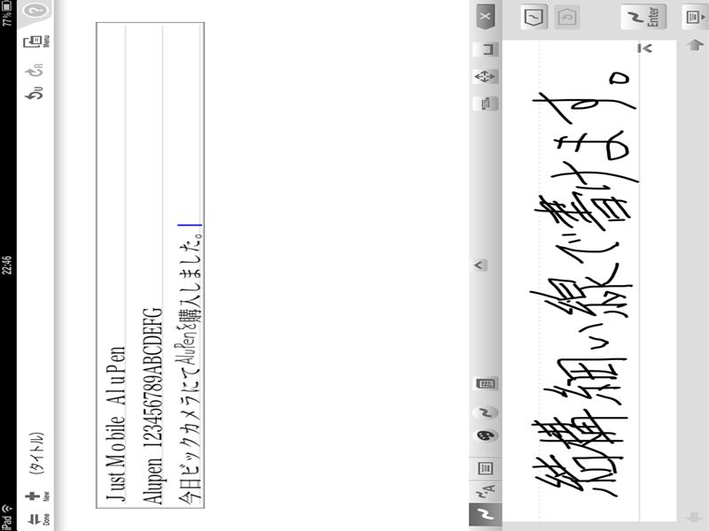 書き心地は想像していたよりも遙かに滑りがよくて、ペンの太さと違って細い線が書けます。他のペンを使ったことが無いので比較は出来ませんが、これは良いと思います。「7notes」の機能を余すところなく引き出してくれそうです。画面が横向きでわかりにくいかも知れませんが細いでしょ。