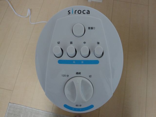 上部から首振り、風量(弱-中-強)、タイマー(0~60~120分)となります。
